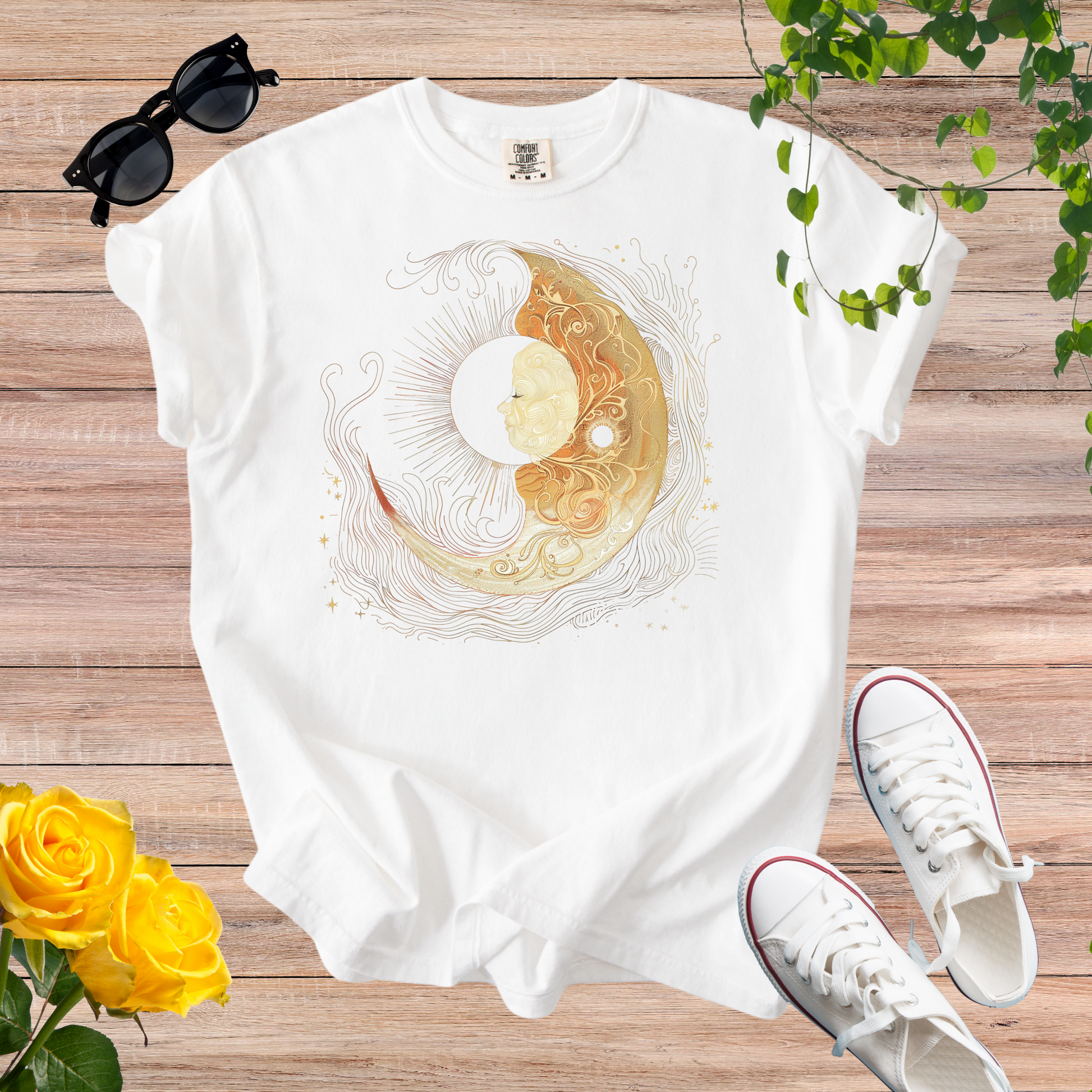 Channel cosmic elegance with the Celestial Harmony T-Shirt — a stunning design featuring an intricately detailed sun and moon illustration surrounded by swirling celestial energy. This cute oversized shirt brings a touch of mystical charm to your wardrobe, making it perfect for astrology lovers, stargazers, and dreamers alike.